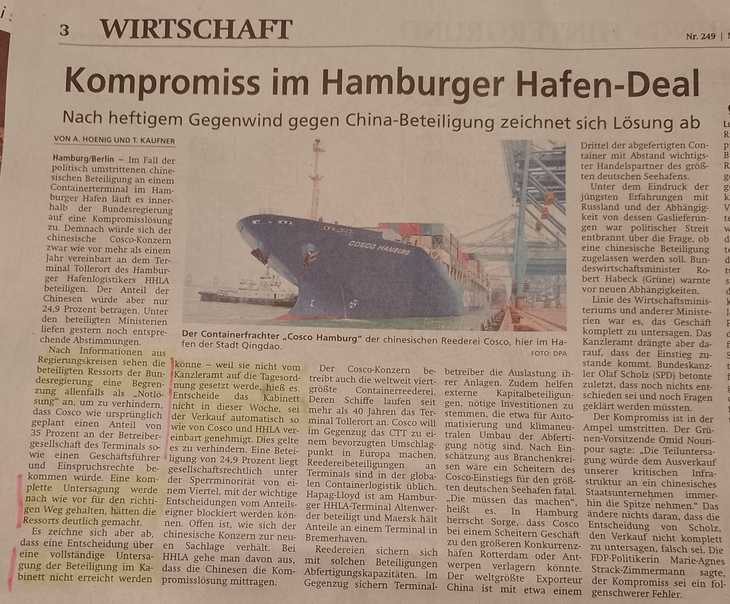 Ich wundere mich schon eine Weile, dass die Hamburger ihren Hafen teilweise an die Chinesen verscherbeln. Wenn wir in Europa so weitermachen, können wir ohnehin bald zusperren und die gewonnene Zeit zum Chinesischlernen verwenden