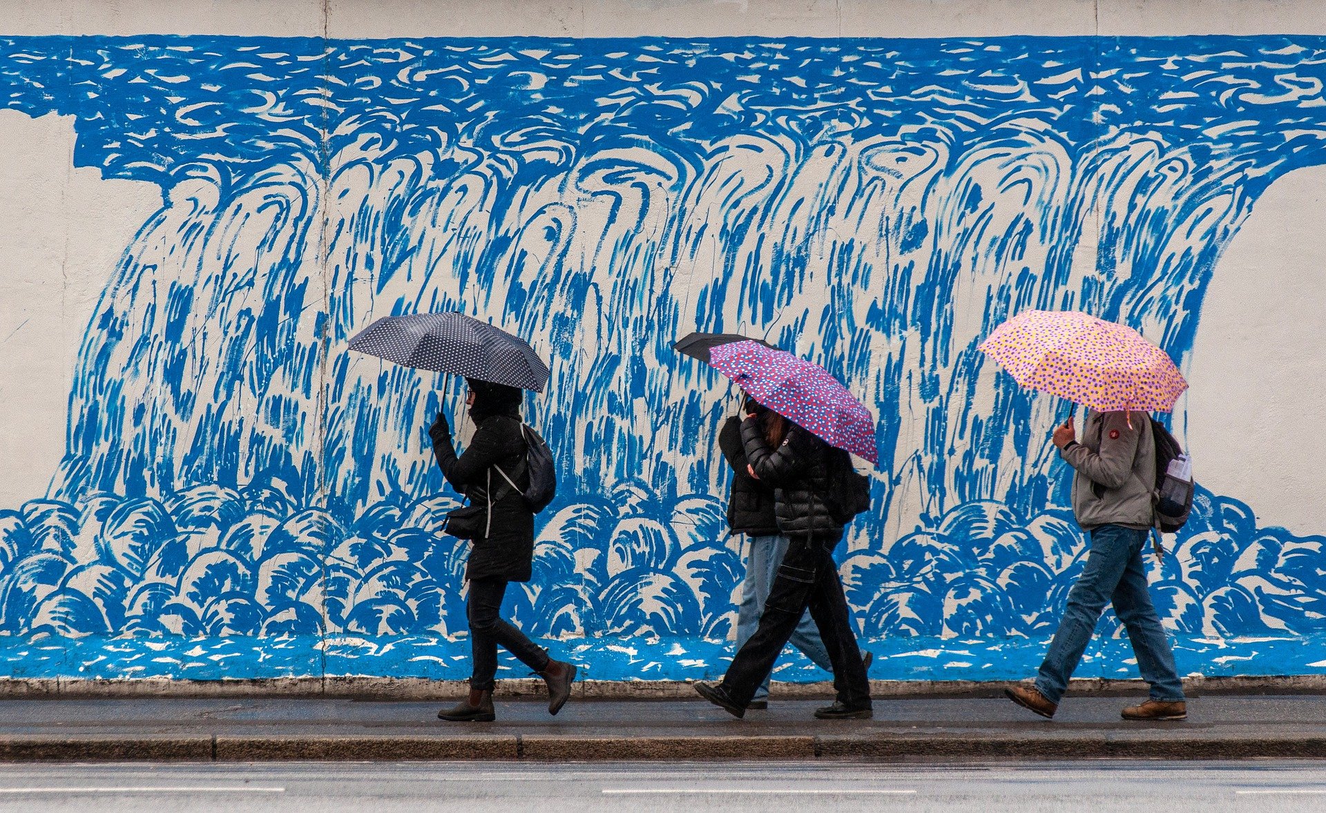 2. Ja, entfremdet trifft es sehr gut. Ich habe versucht, das auch mit dem zweiten Bild darzustellen, wo die Leute vor einem Regenbild ihre Schirme öffnen und die Realität nicht (mehr) wahrnehmen.